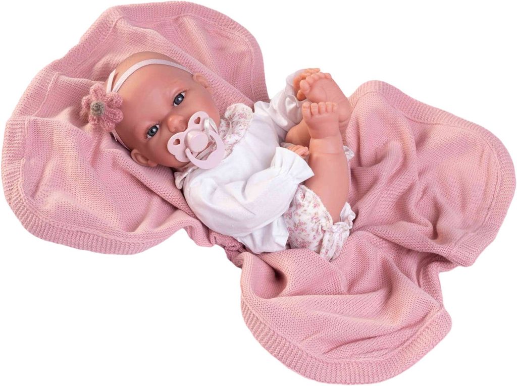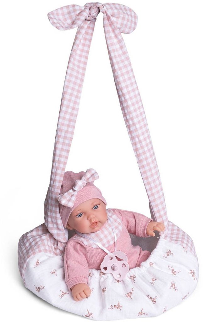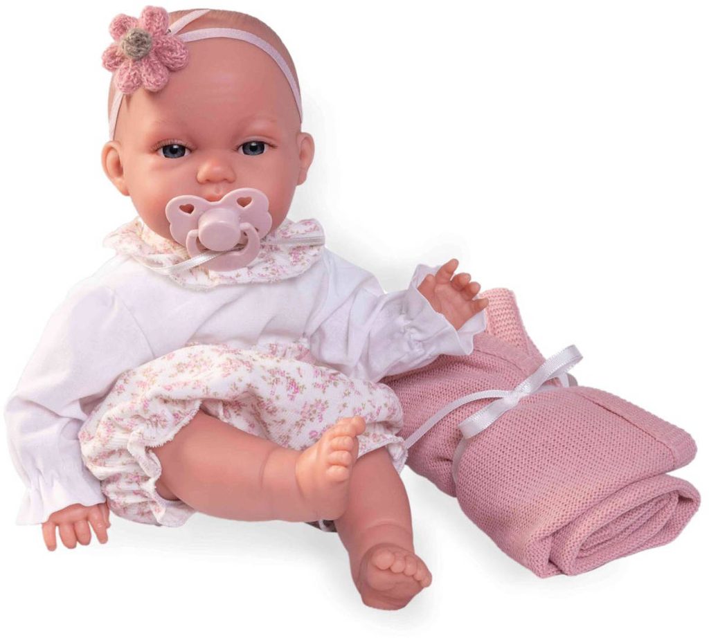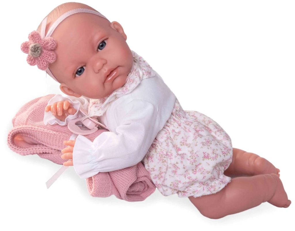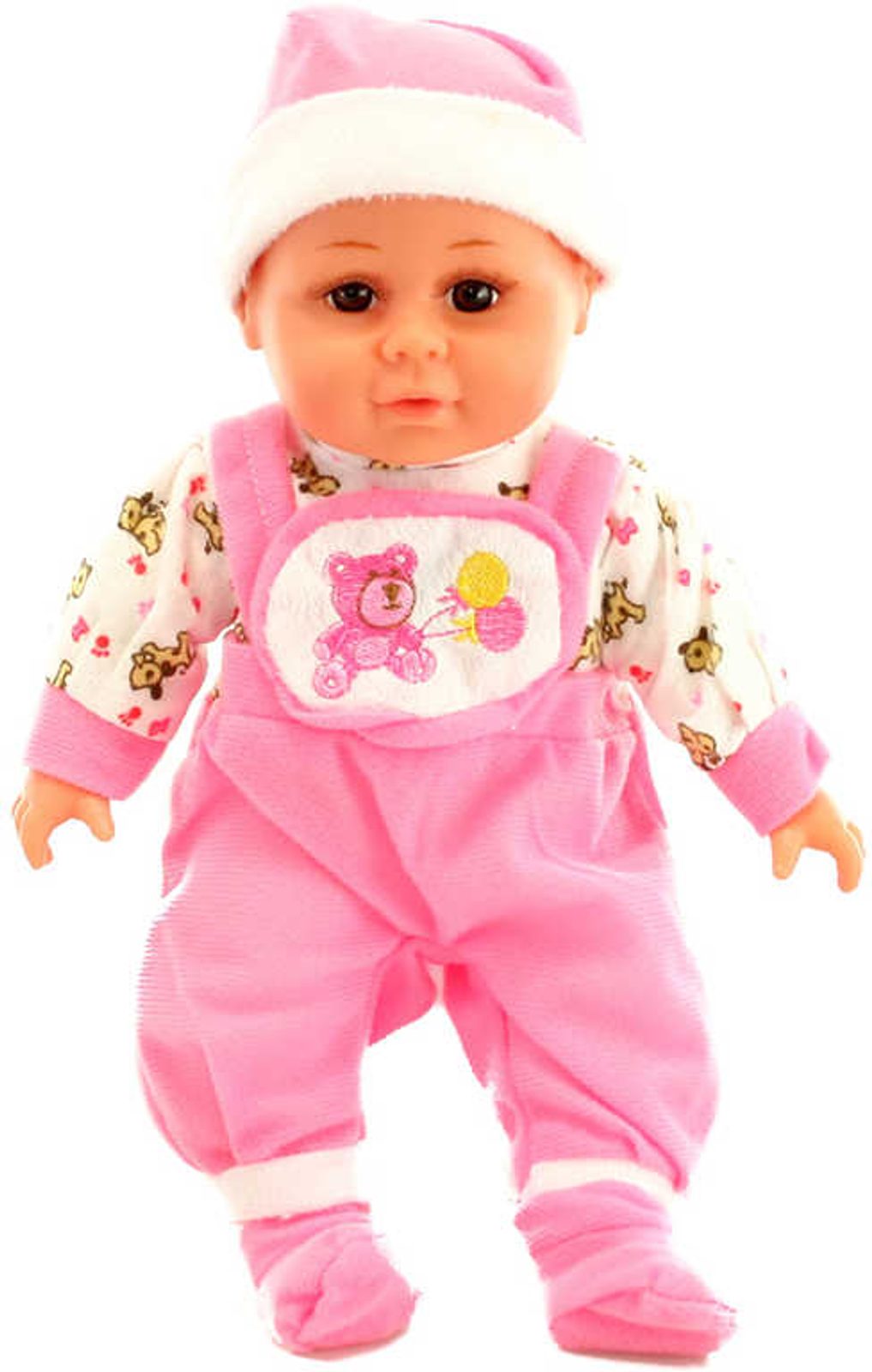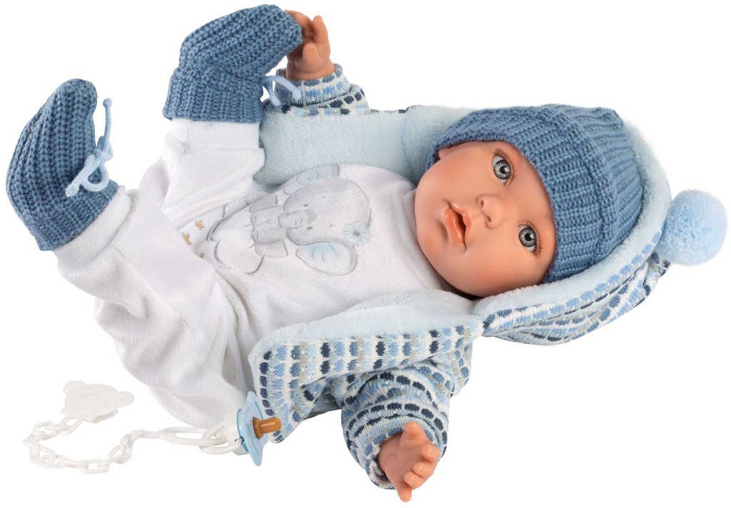 Roztomilé miminko s měkkým tělíčkem. Po stlačení tělíčka začne miminko vydávat zvuky (smích, pláč, mama, tata). Miminko je oblečeno do barevného pyžámka, které lze sundat (suchý zip). Baleno v plastovém