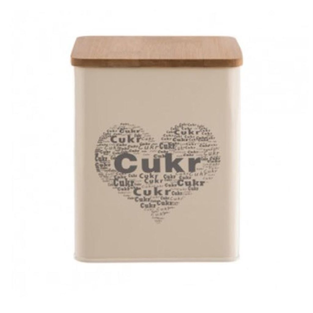 Dóza hranatá s víčkem na uložení cukru nebo cukrovinek. Rozměry : 11,5 x 11,5 cm, výška 14 cm. Barva : smetanová. Materiál : plech, dřevo, silikon - těsnění.