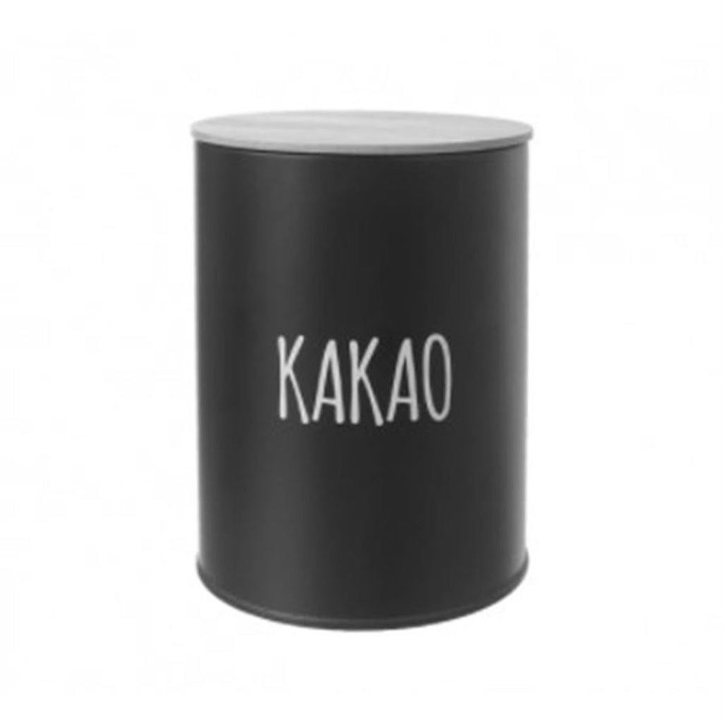 Dóza s víčkem na uložení kakaa. Rozměry : průměr 11 cm, výška 15,5 cm, objem 1,3l. Barva . černá. Materiál : plech, bambus, silikon - těsnění.