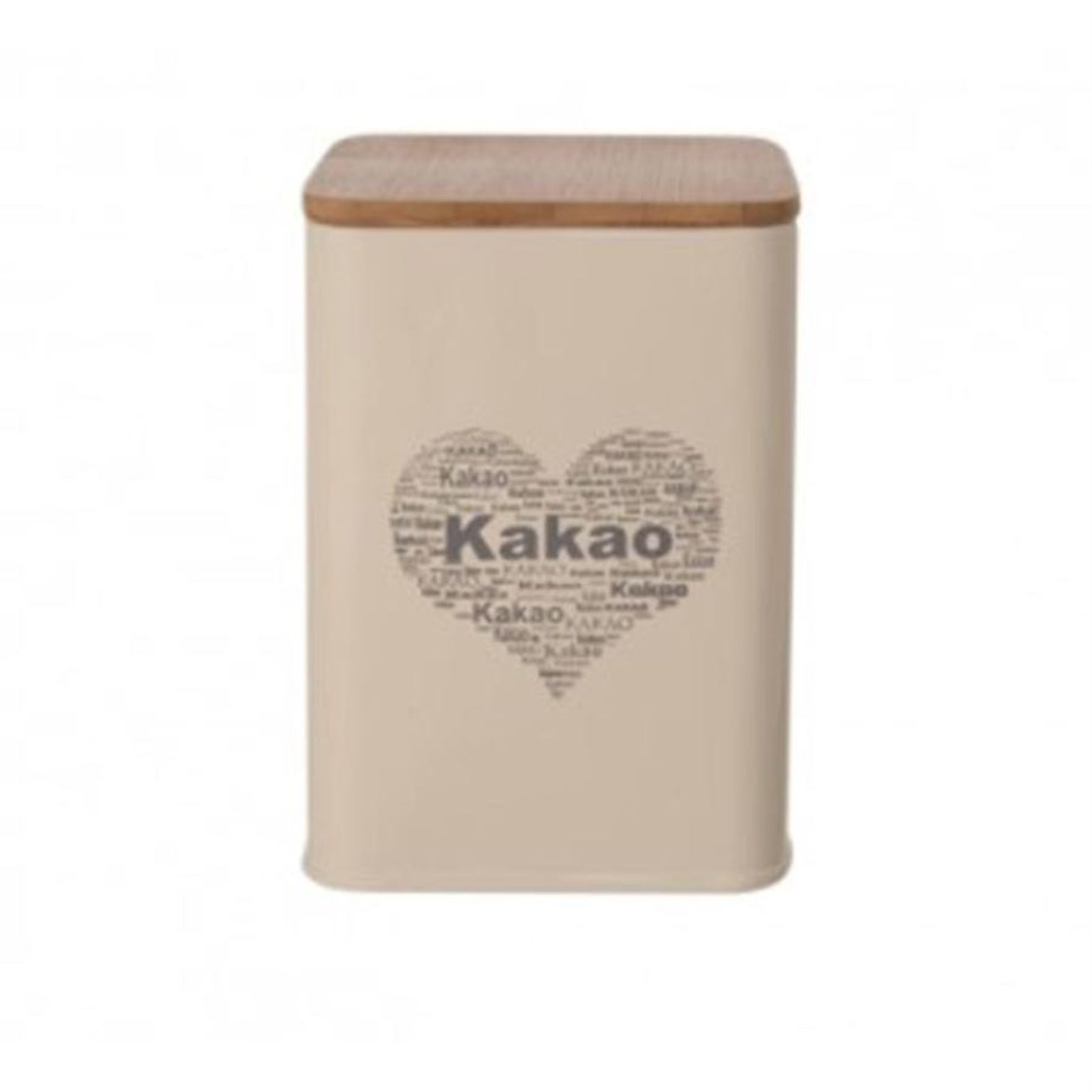 Dóza hranatá s víčkem na uložení kakaa. Rozměry : 9,5 x 9,5 cm, výška 14 cm. Barva : smetanová. Materiál : plech, dřevo, silikon - těsnění.