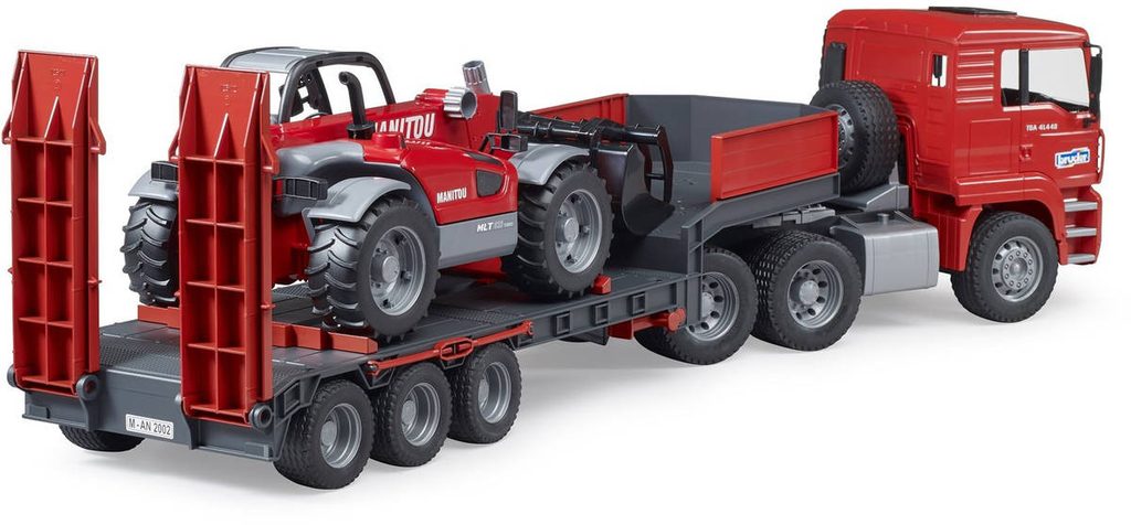 BRUDER 02772 Auto MAN TGA tahač s přívěsem + teleskopický manipulátor Manitou MT633. Detailní model, kvalitní a odolný plast, funkční části, vyrobeno v Německu. Součástí jsou 2 vozidla + přívěs.Nákladní auta s přívěsem se často používají k přepravě velkých či težkých věcí jako jsou třeba stavební stroje. Tento nákladní vůz MAN TGA přepravuje teleskopický manipulátor Manitou MT633. Model má plně funkční návěs, sklopné podpěry a pohyblivé nájezdové rampy. Spolu s ním dodávaný teleskopický manipulátor Manitou má výsuvné a výškově nastavitelné teleskopické rameno a také odnímatelnou lopatu.