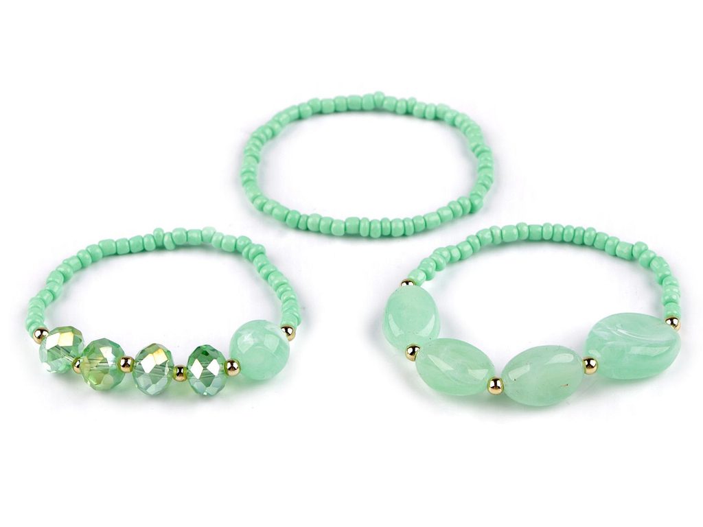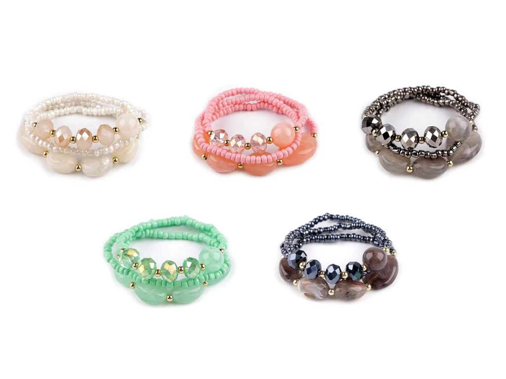 Sada 3 náramků je velice elegantní. Můžete je nosit všechny najednou nebo je použít samostatně. Design, který kombinuje drobné a větší korálky, vytváří harmonický vzhled, který se hodí k jakémukoliv outfitu. Náramky jsou pružné, sestavené z velkých broušených korálků, plastových kamenů a rokajlu. Díky pružence se dobře navlékají na ruku.Šířka celé sady je cca 3,5 cm.