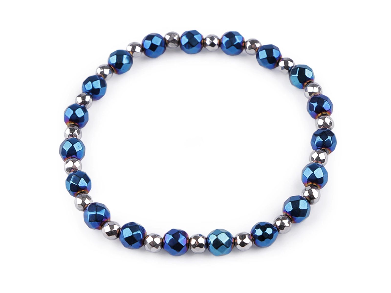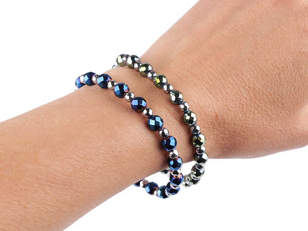 Poutavý náramek je vyrobený z broušených korálků pokoveného hematitu. Díky pružence se náramek snadno natáhne na ruku, má univerzální velikost. Hematitový náramek patří mezi šperky, které díky své fascinující povrchové úpravě zaujmou na první pohled. Broušené plošky vytvářejí efektní světelné odlesky. Náramek potěší každou ženu, je dárkem, se kterým nešlápnete vedle. Hodí se ke slavnostním příležitostem, skvěle podtrhne i business styl oblékání.- Materiál: hematit