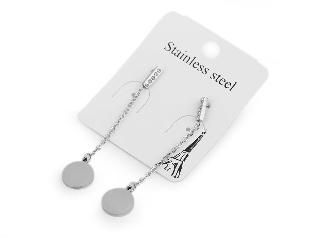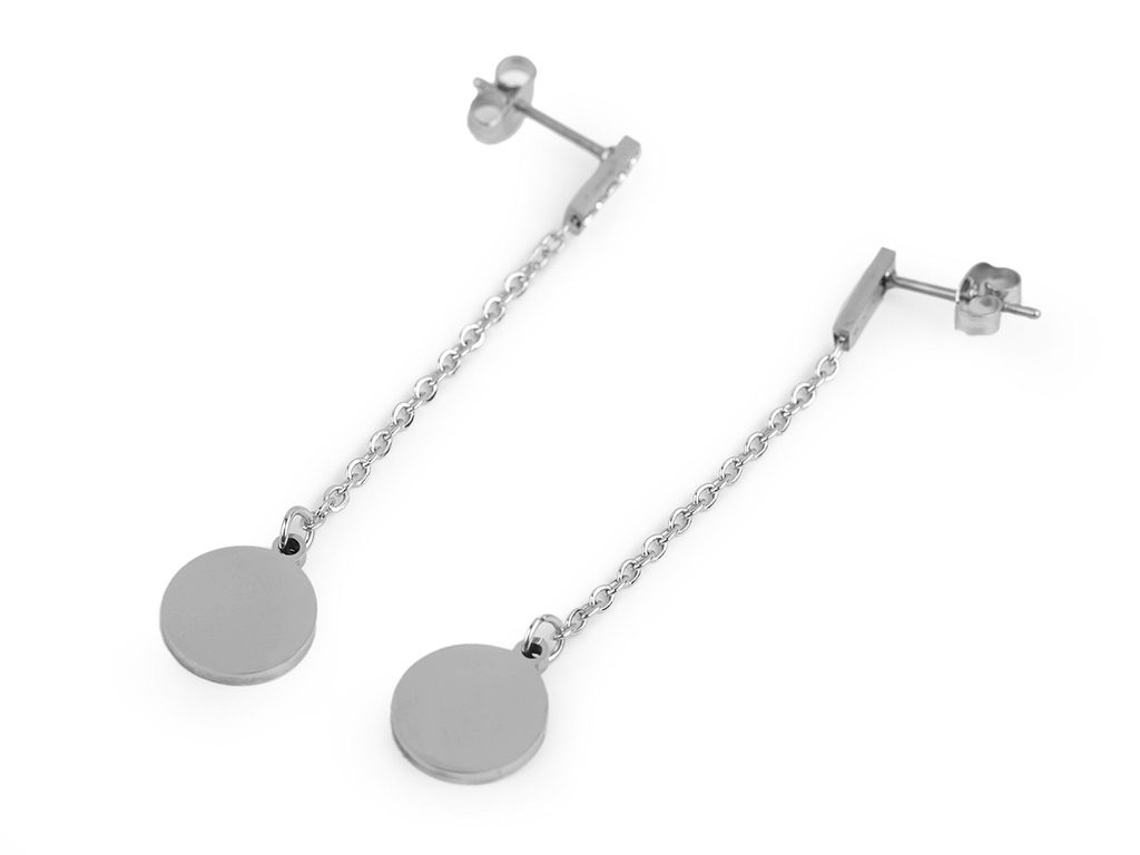 Efektní visací náušnice s placičkami a broušenými kamínky jsou vyrobené z kvalitní chirurgické oceli. Díky broušeným kamínkům nádherně jiskří. Protáhnou a zeštíhlí linii šíje. Mají vysoký zrcadlový lesk. Placičky s řetízky se při každém pohybu hlavy houpou.Puzeta je s kovovou zarážkou proti vypadnutí.