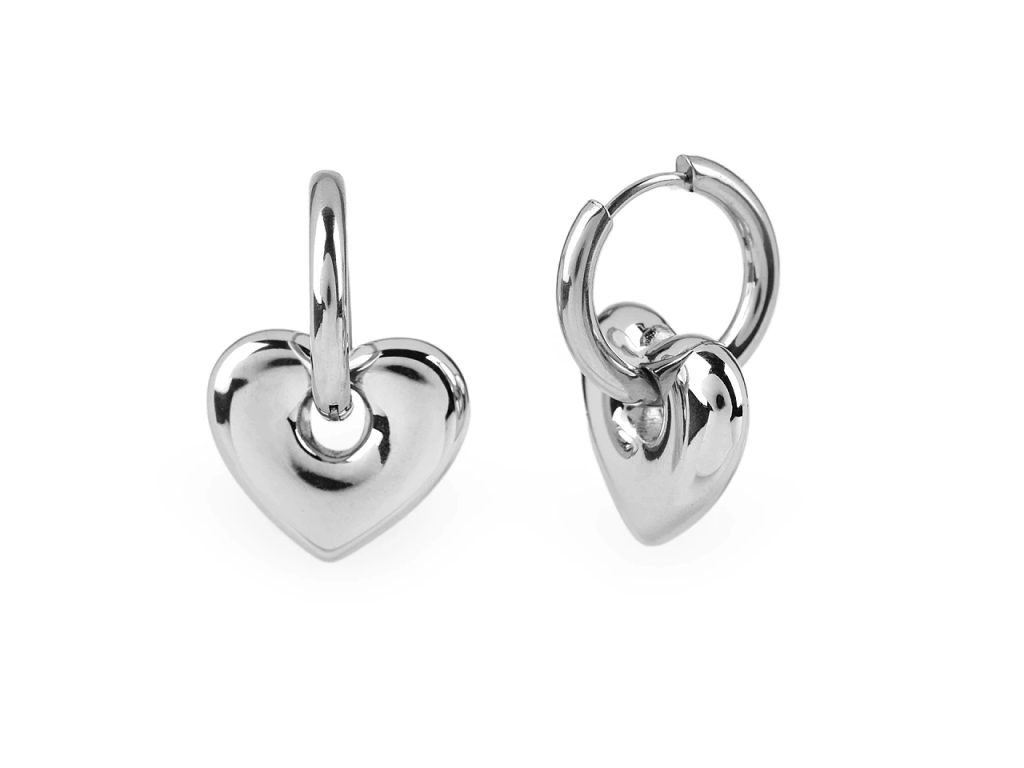 Náušnice kroužky jsou vyrobené z kvalitní nerezové oceli. Dole jsou ozdobené přívěskem srdíčka, jsou velice elegantní. Oceníte je ke každodennímu nošení, ale hodí se i ke slavnostním příležitostem. Skvěle doplní byznys styl oblékání, jeansovou módu, ležérní outfity i společenské šaty.Dají se rozevřít, zapínají se zacvaknutím.