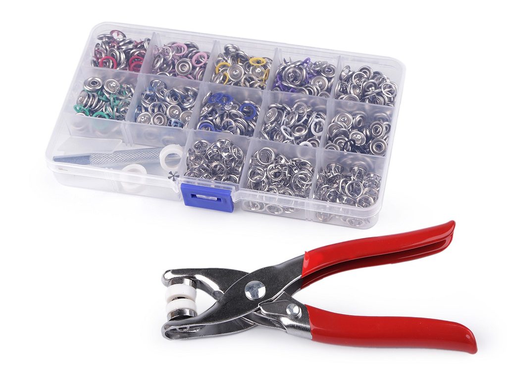 Kovové stiskací knoflíky (patentky) využijete jako zapínání na oblečení a doplňky. K aplikaci vám pomůže ruční lis, který je součástí sady, nebo můžete využít i razič (délka 7 cm)V praktickém boxu najdete patentky v 10 barvách po 20 sadách.