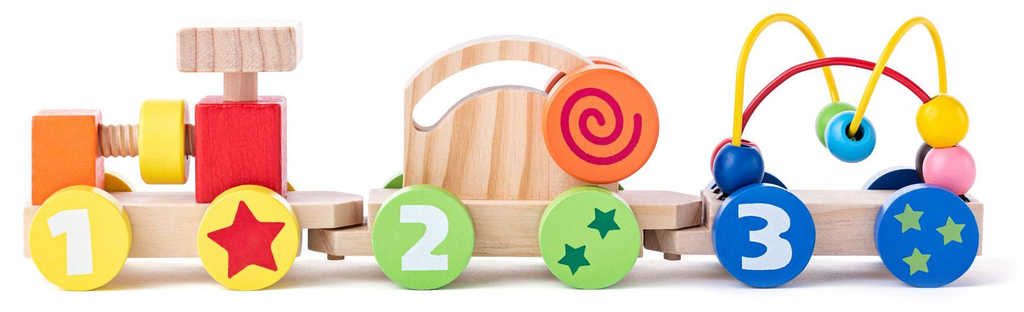 ***Vláček pro nejmenší nabízí dětem hned několik prvků k procvičení jemné motoriky: šroub na lokomotivě, korálky na drátěné konstrukci, pohyblivé kolečko.
