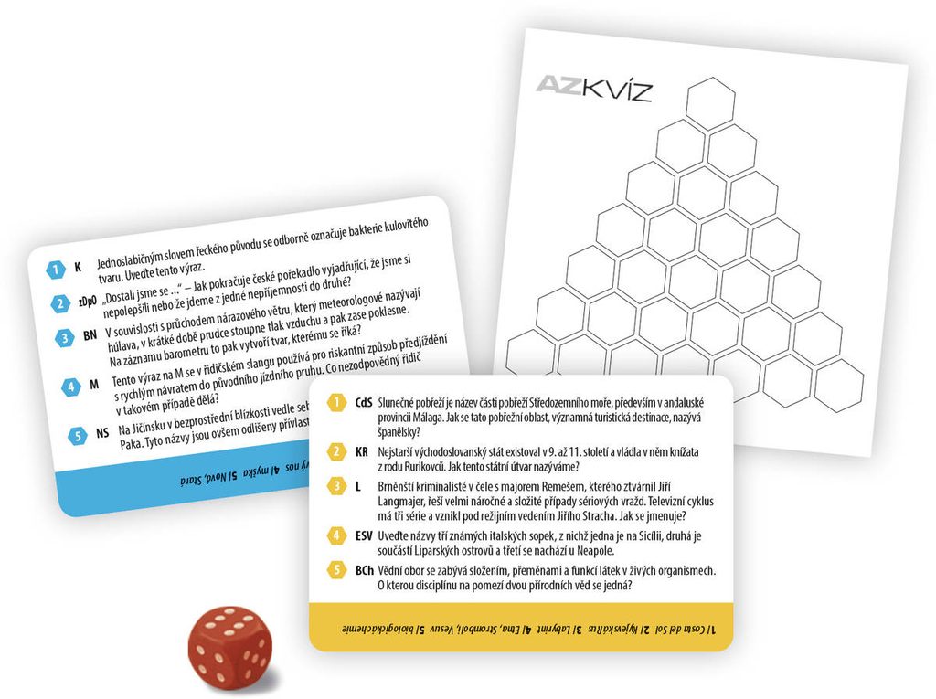 Společenská vědomostní hra AZ kvíz na cesty – NOVÉ OTÁZKY vychází z pravidel úspěšné televizní soutěže. Cestovní verze, 600 otázek.Svoji oblíbenou hru si tak můžete zahrát kdekoliv a porovnat své znalosti se svými přáteli. Hru je možné hrát samostatně nebo můžete kartičky použít k rozšíření zásoby otázek ve velké hře AZ kvíz.