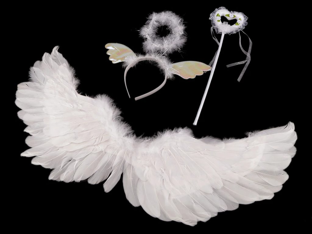 S karnevalovým kostýmem se každá malá holčička promění v roztomilého andílka. Kostým se skládá z péřových křídel, hůlky a čelenky se svatozáří.Křídla jsou oboustranná, bohatě pokrytá peřím, nasazují se pomocí gumiček.