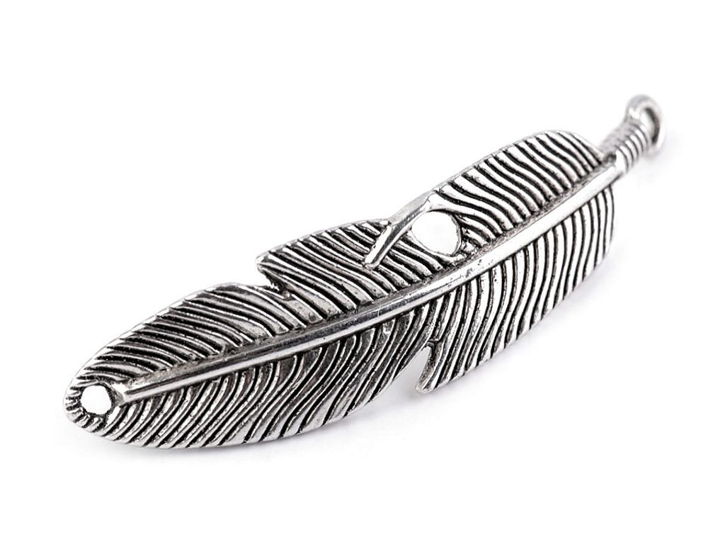 Kovová pírko má prohnutý tvar. Patinová povrchová úprava mu dodává vintage vzhled a zvýrazňuje jeho kresbu.Pírko je jednostranné, z nemagnetického kovu.