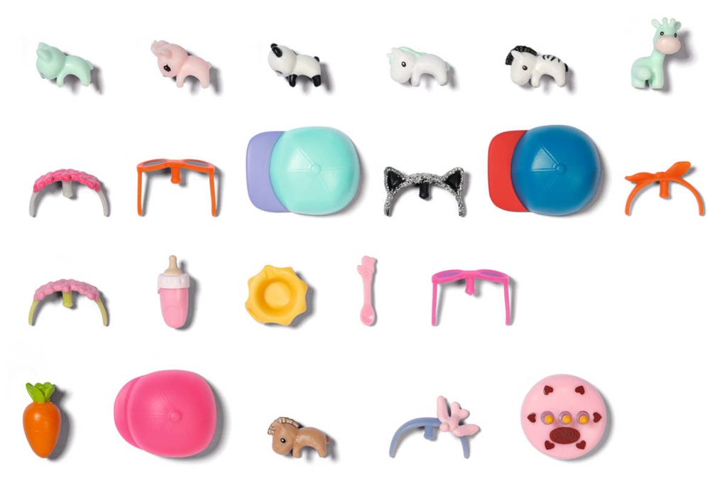 • Některé panenky mají efekt změny barvy a některé mají vyměnitelný doplněk. Součástí je malý sběratelský plakátek a aršík se samolepkami BABY born Minis.