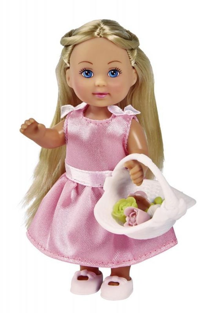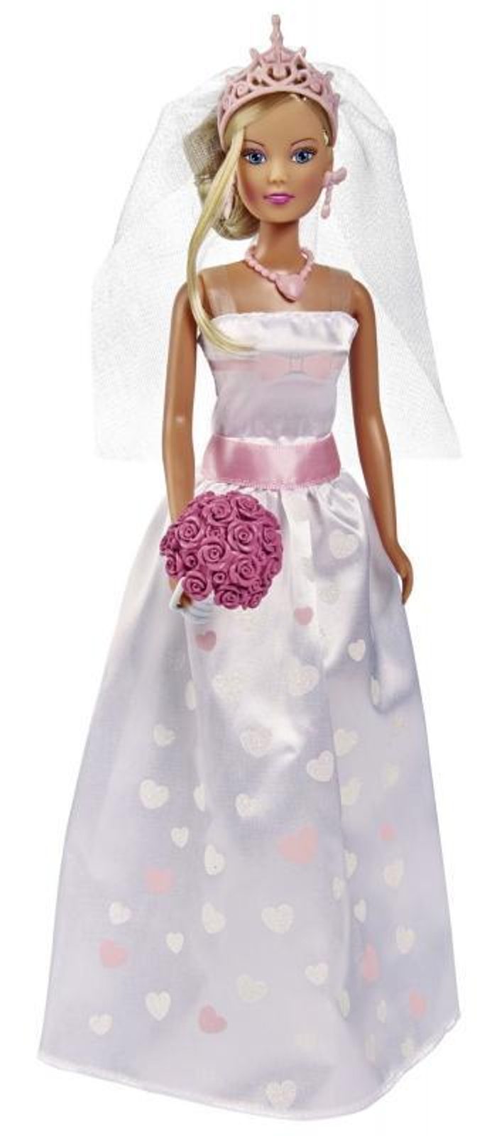 Panenka Steffi s kyticí růží v nádherných svatebních šatech, s panenkou Evičkou v růžových šatičkách družičky s košíčkem s květy. Velikost panenek 29 a 12 cm.
