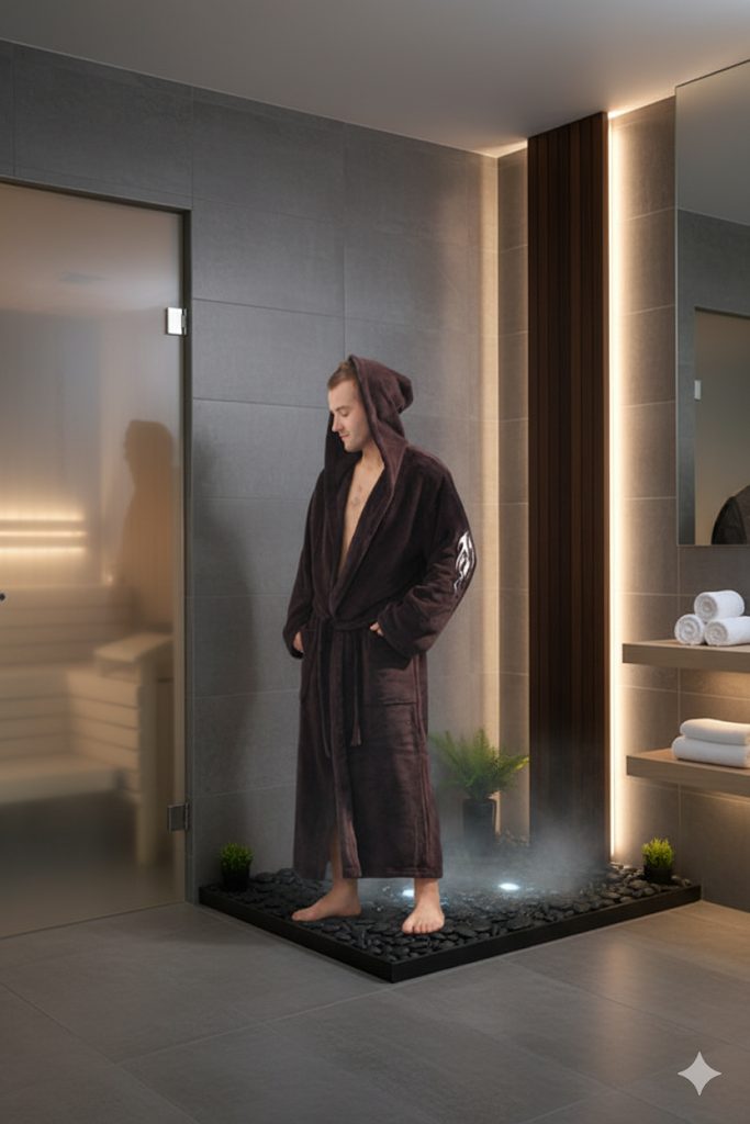 Velmi oblíbený pánský župan Tribal od českého výrobce Vestis. Dlouhý župan s kapucí, velkými kapsami po bocích a zavazováním v pase. Župan má na rameni moderní výšivku.
