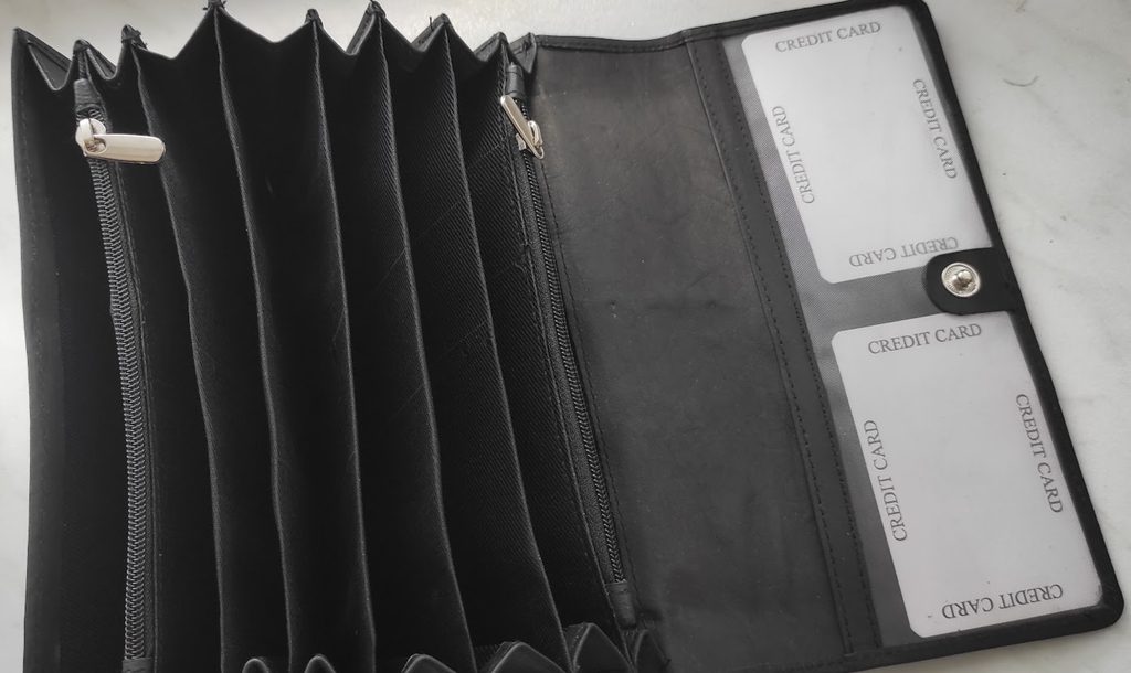 Osm přihrádek na papírové bankovky, dvě zipové kapsy na drobné mince, průhledné pouzdro, kapsa na zadní straně.
