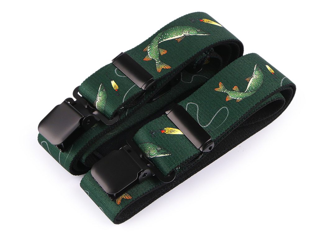 Kšandy s rybím potiskem potěší všechny rybáře. Kšandy bývají nedílnou a zároveň praktickou součástí jejich oblečení.Jsou kvalitní české výroby, elastický materiál umožňuje pohodlné nošení. Zadní vsadka z eko kůže jim dodává stylový vzhled. Ke kalhotám se upevňují na tři žabky - dvě vpředu a jednu vzadu.