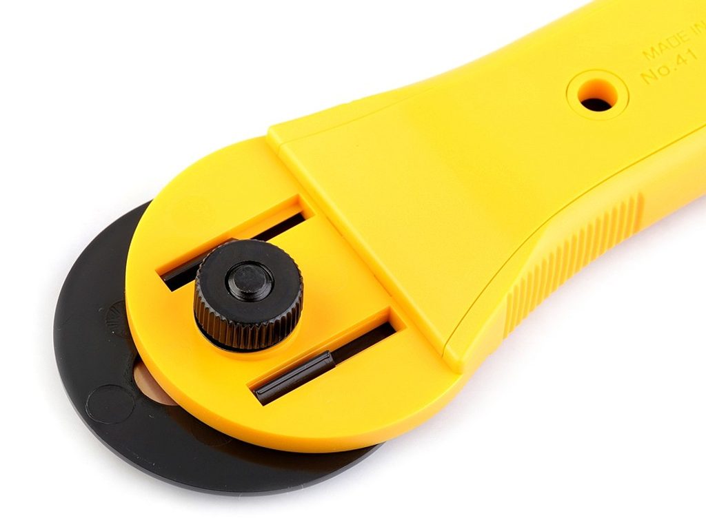 Rotační řezací kolečko Olfa Prym je vhodné na řezání vzorů z textilu, kůže a papíru. Je velice oblíbené při patchworku, protože s ním můžete řezat dlouhé pásy nebo i více vrstev látky nad sebou. To je velice výhodné, protože to urychluje práci při řezání malých stejných tvarů, nůžkami by to bylo mnohem zdlouhavější.Má pohodlné a snadné uchopení rukojeti. Ostrá čepel z wolframové oceli má průměr 4,5 cm. Jak název napovídá, kruhový kotouč se při řezání otáčí a zajišťuje tak hladký záběr. Jeho odolný materiál má dlouhou životnost. Práce s řezacím kolečkem je bezpečná, vysoce ostrý kotouč je umístěný za bezpečnostním krytem, když se nepoužívá.