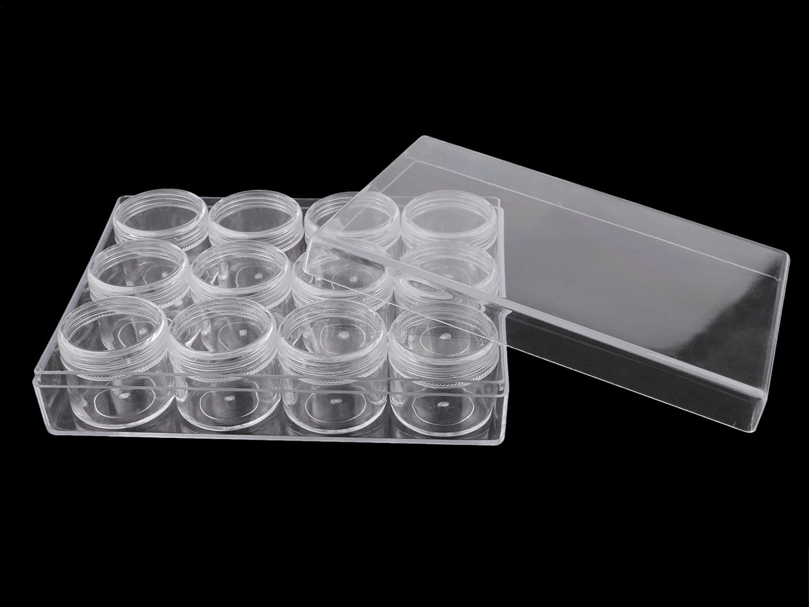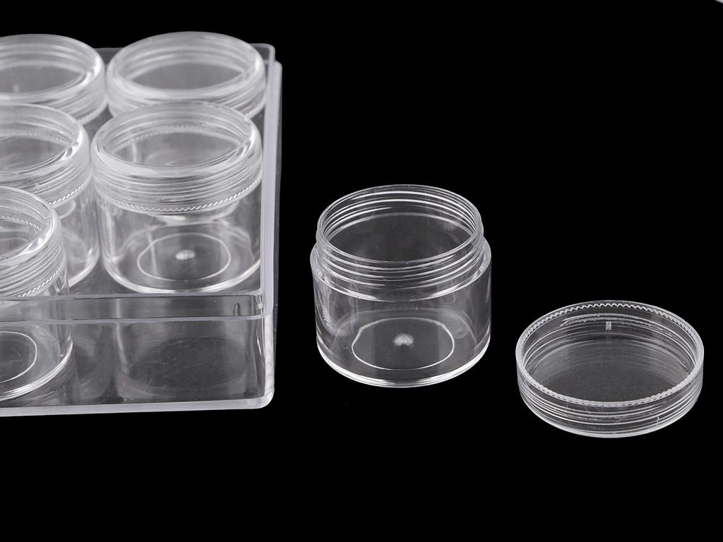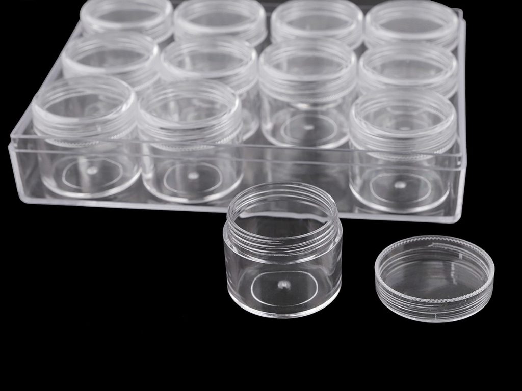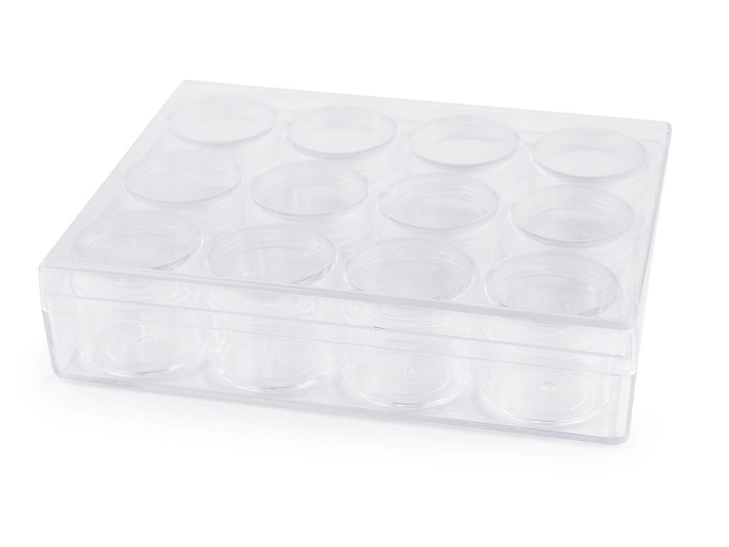 Krabičku s 12 šroubovacími dózičkami využijete na uložení a přenášení drobného materiálu, jako jsou korálky, malé knoflíčky, flitry, glitry, hot-fixy, různé drobné komponenty na scrapbooking apod. Dózičky jsou šroubovací, díky transparentního materiálu je do nich dobře vidět. Víko od krabičky se dá celé sundat.Průměr šroubovacích dóziček je 3,8 cm, výška 3,3 cm.