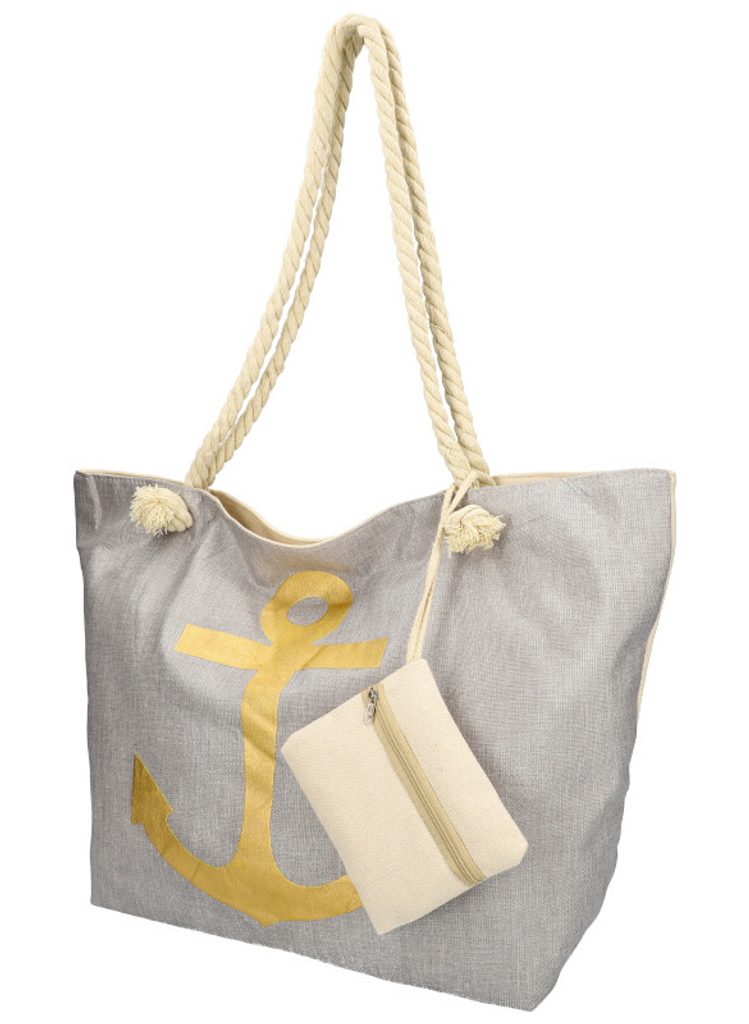 Elegantní velká plážová taška v šedé barvě se zlatou kotvou. Lehká, prostorná a pohodlná, ideální na pláž, bazén i letní výlety. Skvělý doplněk na dovolenou s dostatkem místa