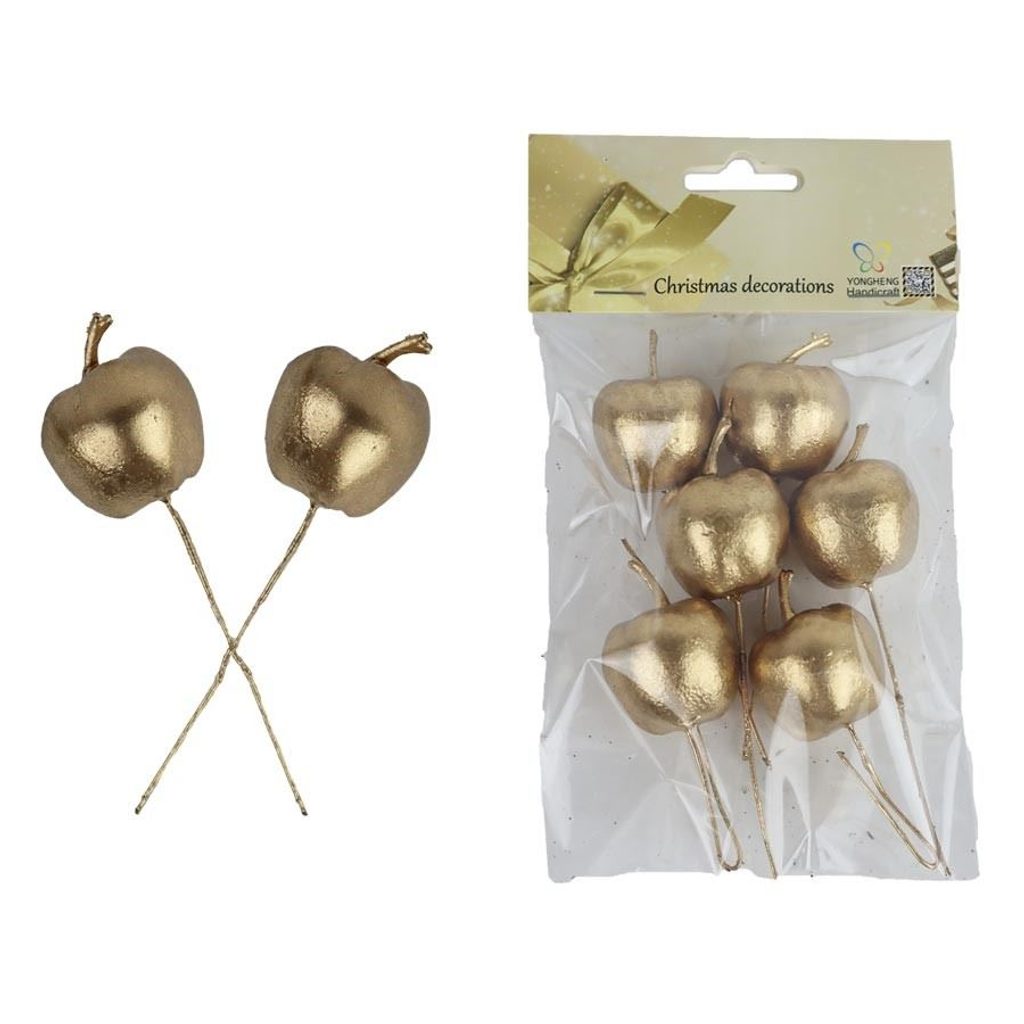 Sada dekoračních jablíček. Sada obsahuje 6 jablíček. Rozměry : průměr 3 cm, výška 3,5 cm, celková délka zápichu 10,5 cm. Barva : zlatá. Materiál : plast.