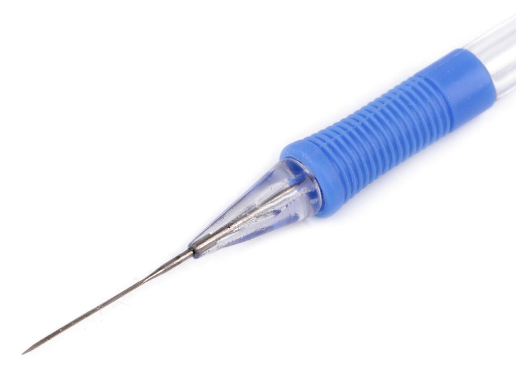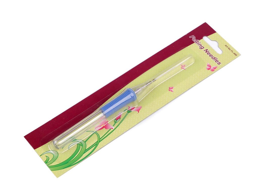 Bez jehly na plstění se neobejdete, pokud plstíte technikou vypichování. Má praktickou plastovou rukojeť, která se pohodlně drží v ruce, tudíž odpadá náročné držení jehly v prstech. Jehla se v rukojeti nedá vyměnit, je pevná.Jehla je trojhranná, po stranách má drobné drážky na zachycení vlny. Její střední velikost se hodí od začátku práce až na finální tvarování.