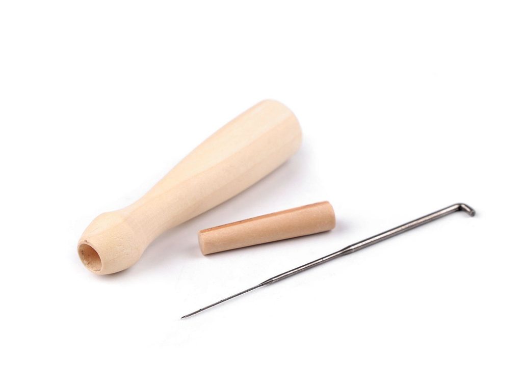 Bez jehly na plstění se neobejdete, když plstíte technikou vypichování. Má praktickou dřevěnou rukojeť, jež se pohodlně drží v ruce, tudíž odpadá náročné držení jehly v prstech.Jehla je trojhranná, po stranách má drobné drážky na zachycení vlny. Jejístřední velikost se hodí od začátku práce až na finální tvarování. V držáku se dá díky jednoduchého systému jehla vyměnit.
