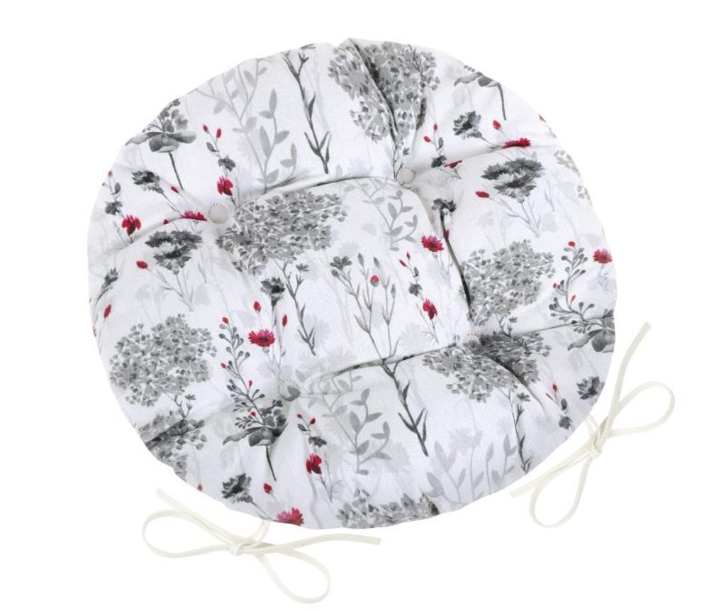 Kulatý prošívaný sedák se šňůrkami na zavazování. Materiál je velice kvalitní a odolný vůči poškození. Krásně se dá kombinovat s polštářkem, chňapkou, nebo ubrusem.- Barva: šedé větvičky - šedá, červená, bílá