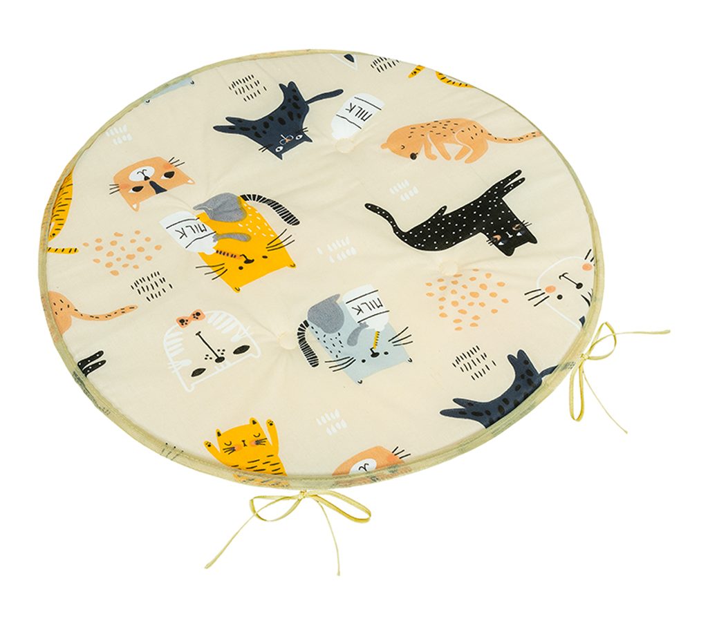 Sedák kulatý hladký se šňůrkami, uvnitř je 2 cm vysoký polyuretan, sedák je na čtyřech místech prošitý okrasným stehem proti pohybu vnitřní vyplně. Praní na 30C v automatické pračce.- Barva: Kočka žlutá, béžová, černá, šedá