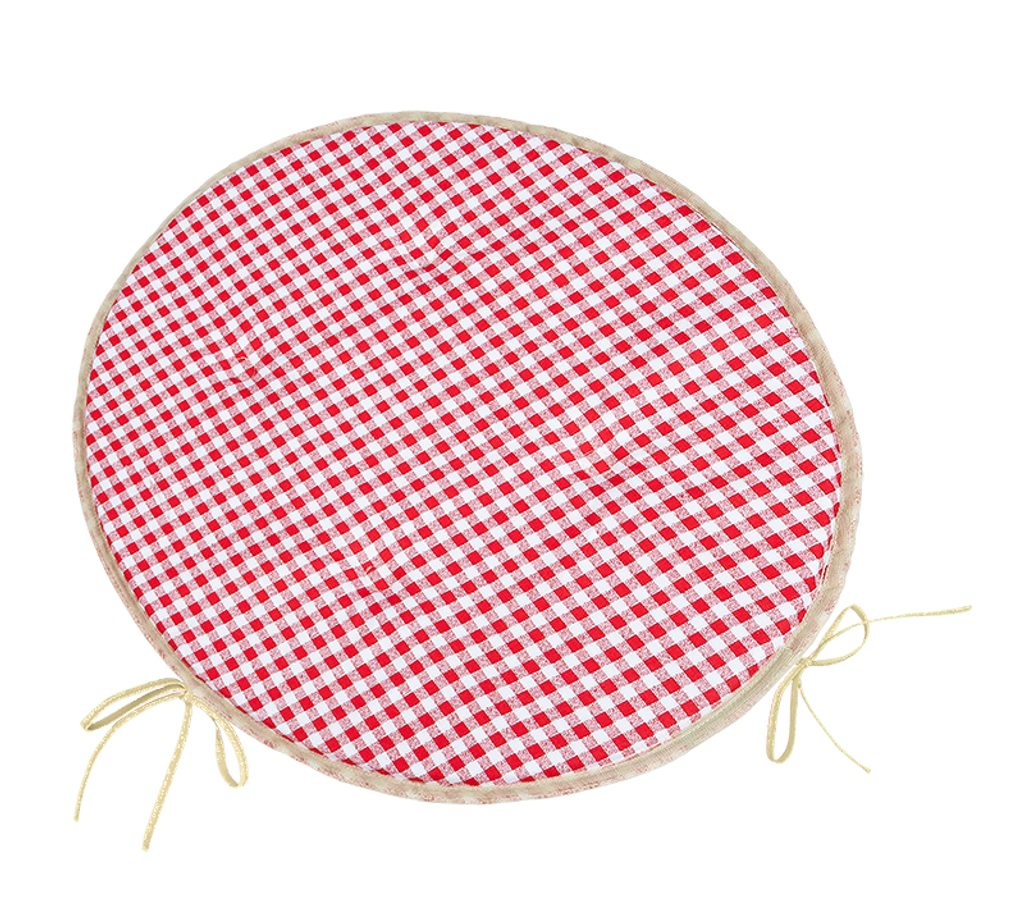 Sedák kulatý hladký se šňůrkami, uvnitř je 2 cm vysoký polyuretan, sedák je na čtyřech místech prošitý okrasným stehem proti pohybu vnitřní vyplně. Praní na 30C v automatické pračce.- Barva: Kostička červená
