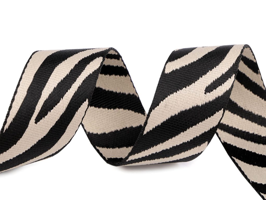 Oboustranný textilní popruh svým designem imituje zebru. Využijete ho na kabelky, batohy a tašky.- Šíře:: 38 mm
