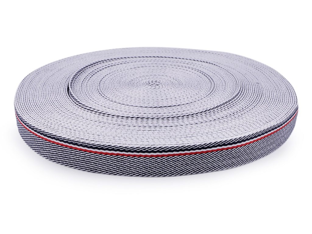 Oboustranný textilní popruh je vhodný jako ucho na batohy, tašky i kabelky. Využijete ho také na výplety nábytku, lehátek, saní, lemování textilních výrobků nebo na výrobu opasků.