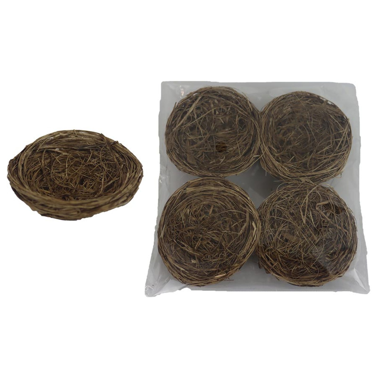 Dekorační hnízdo. Balení obsahuje 4 hnízda. Rozměry : průměr 9 cm, výška 3 cm. Barva : přírodní. Materiál : přírodní.- Rozměr: dia 9 x 3 cm