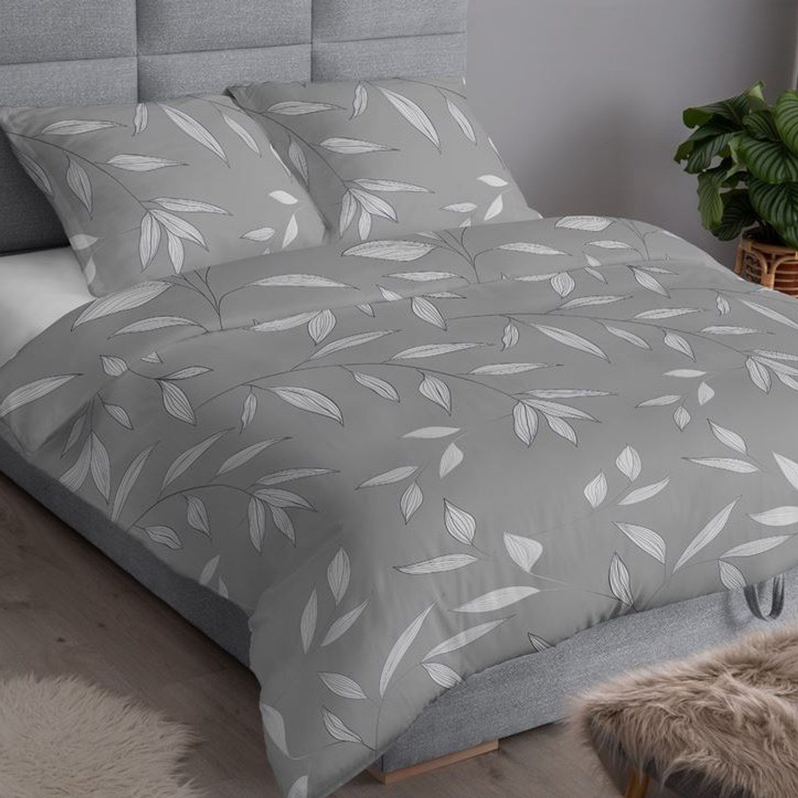 Jemné a hebké povlečení z bavlněného saténu. Moderní a osvědčený materiál vyhledávaný pro svou kvalitu zpracování. Povlečení zdobí lístky se stříbrnými okraji na šedém podkladu.