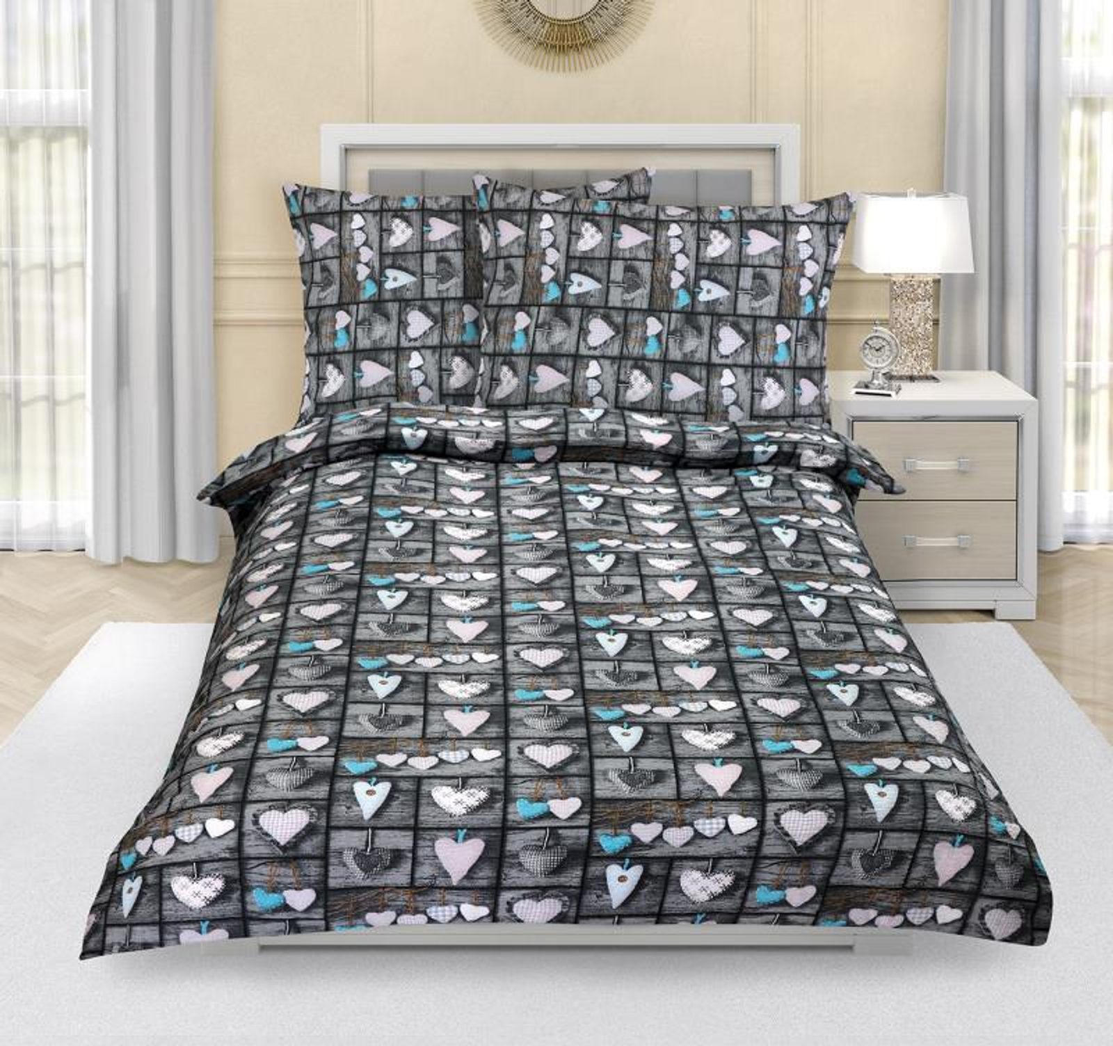 📌 Povlečení krepové - 140x200,70x90 cm srdce patchwork šedé