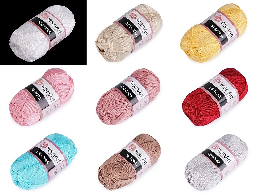 Pletací příze Begonia je vyrobená z mercerované bavlny. Mezi její výhody patří, že je na dotek jemnější, lesklejší a stálobarevná. Využijete ji na pletení či háčkování dekorací, hraček, zvířátek, ponožek, svetříků, dětských doplňků i oděvů apod.Velikost jehlic: 3