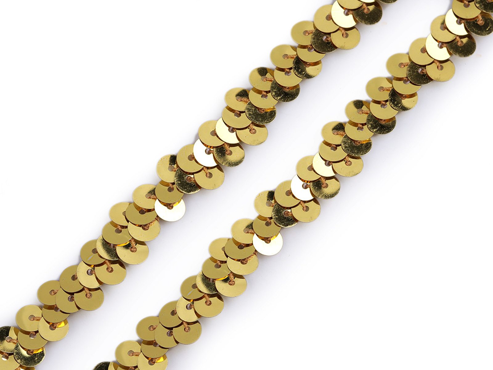 Elastický flitrový prýmek je velice efektní. Usnadní vám práci s jednotlivým našíváním flitrů. Flitry jsou připevněné na tenkou pruženku cik - cak způsobem. Působí, že jsou ve třech řadách. Po maximálním natažení pruženky se seřadí do jedné řady.