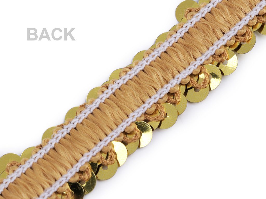 Průměr flitrů je 6 mm. Horní strana prýmku má šíři cca 20 mm, spodní strana má šíři 18 mm.