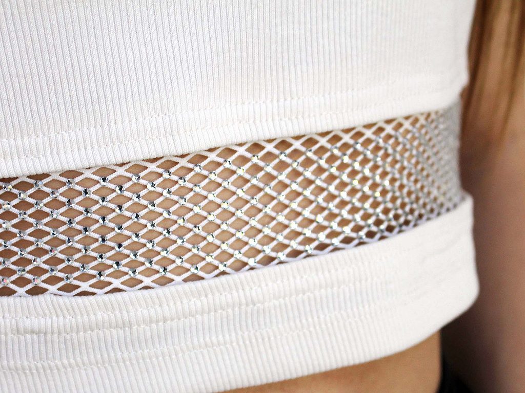 Elastická síťovina s broušenými kamínky je velice poutavá a elegantní. Díky elastanu je síťovina perfekně pružná. Je skvělá na šití a zdobení exkluzivních modelů triček, šatů, sukní, halenek apod. S oblibou se používá i na šití sportovních tanečních kostýmů a dresů. Pruží do všech stran, navíc se netřepí - není třeba obšívat okraje.Otvory v síťovině mají rozměry 4 x 6 mm.