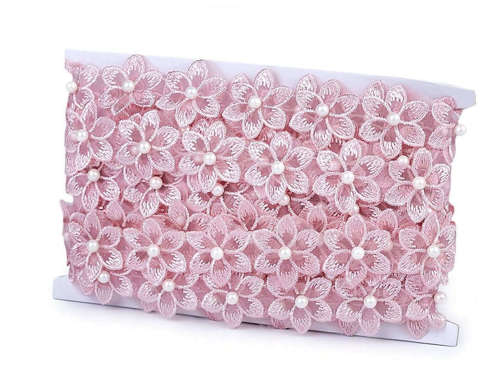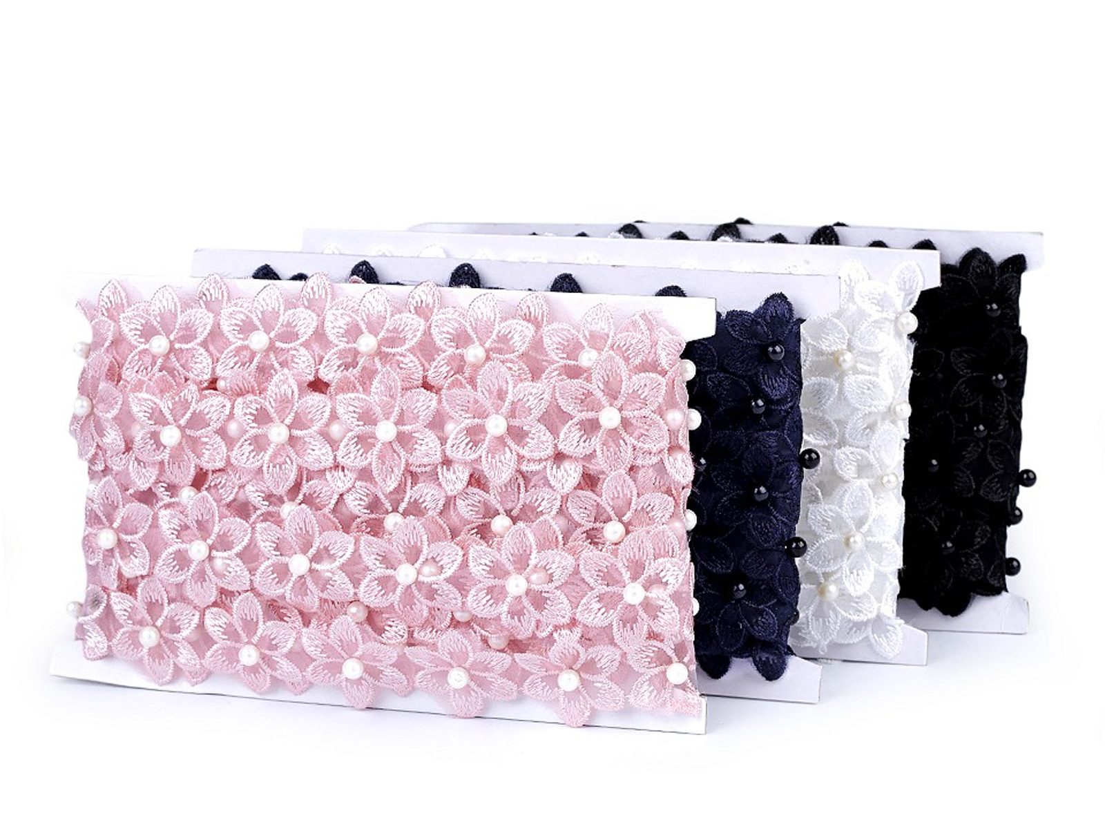 Prýmek s květy a perlou dodá romantický vzhled vašim šatům, halenkám nebo svetříkům. Perly jsou přinýtované. Květy můžete rozstříhat a použít zvlášť.