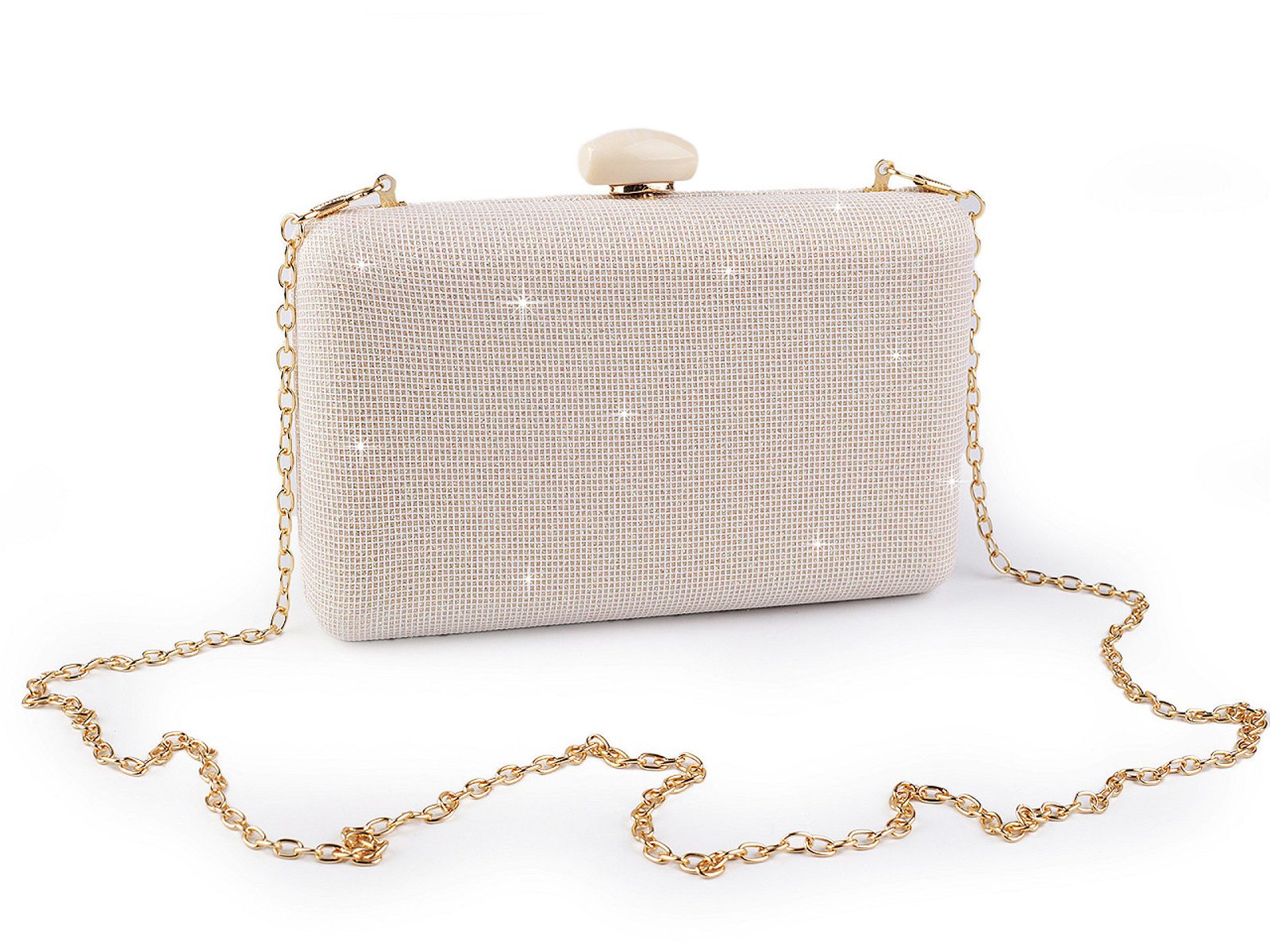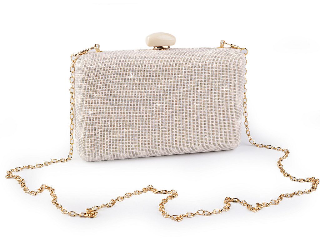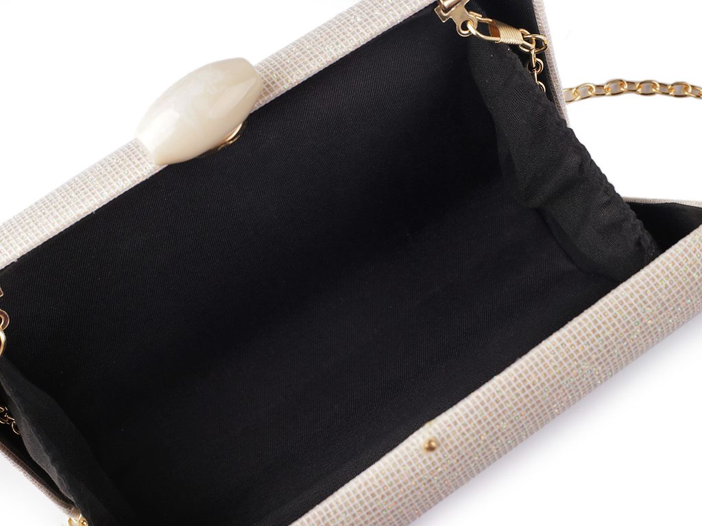 Luxusní společenská kabelka je skvělým doplňkem pro každou příležitost, kdy chcete vypadat stylově a elegantně. Zaujme svou povrchovou texturou s jemnými glitry a precizním zpracováním. Zdobí ji velké oválné zapínání. Je pevně vyztužená, skořepinová, její součástí je dlouhý odnímatelný řetízek na karabiny. Můžete ji nosit v ruce nebo jako crossbody přes rameno či do kříže.Glitry jsou pevné, neodírají se.