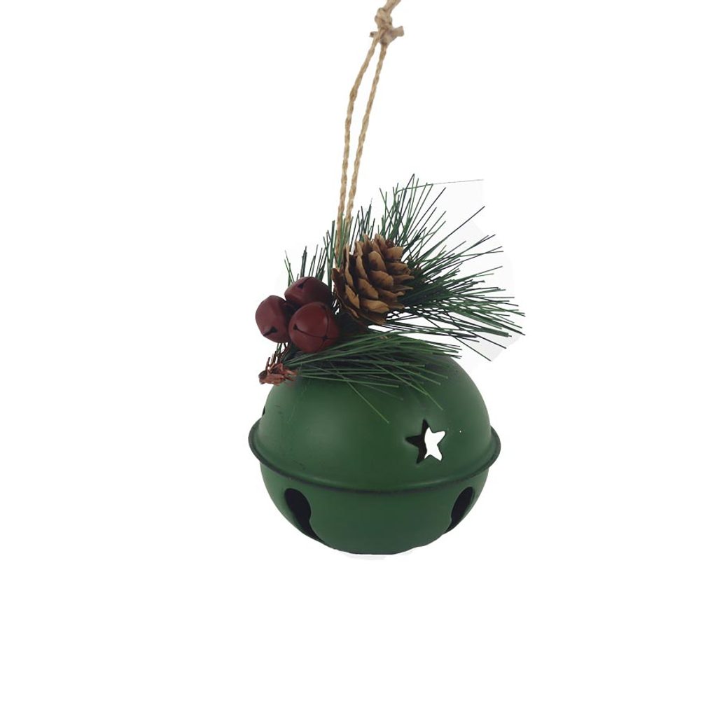 Dekorační rolnička k zavěšení. Rozměry : průměr 8 cm, výška 6 cm, celková výška dekorace 11 cm. Barva : rolnička zelená, dekorace,červená. Materiál : kov, plast.