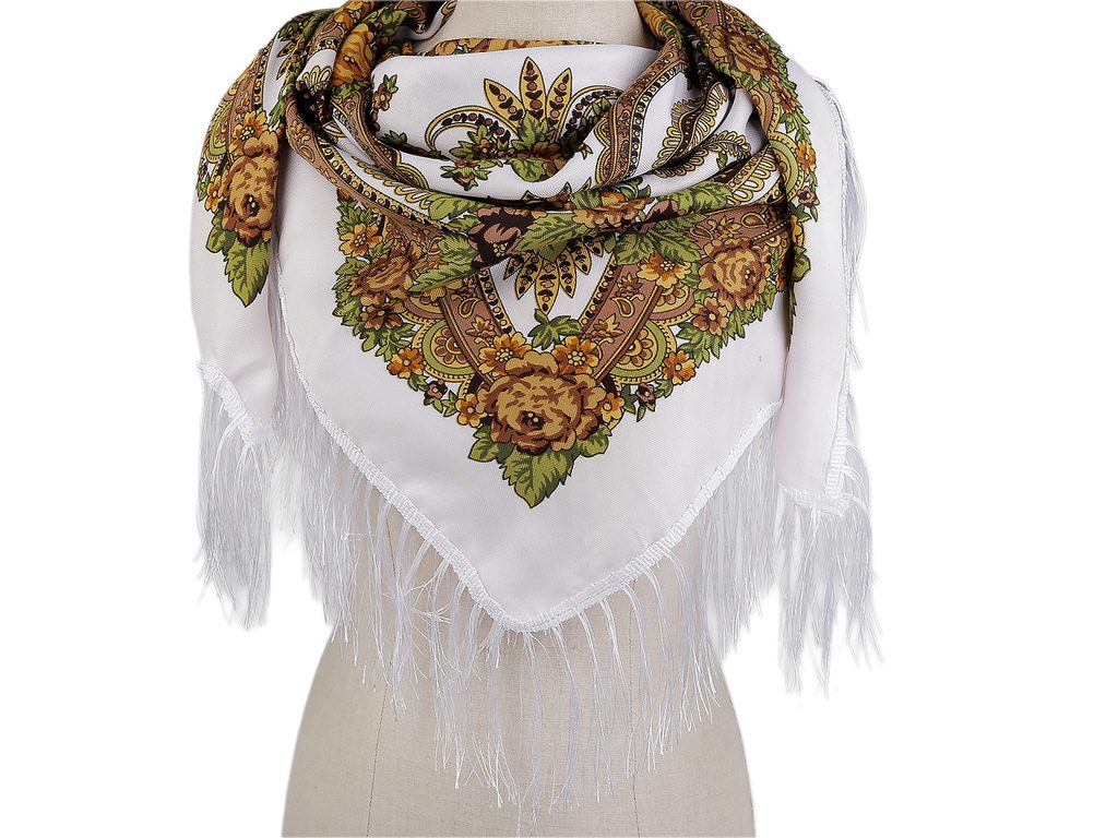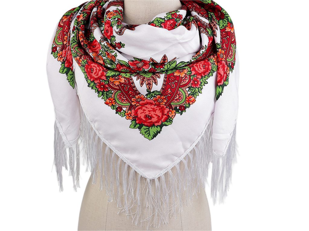 Velký folklórní šátek je doslova jako z dob našich babiček. Býval součástí tradičního oblečení a krojů. Je vyrobený z příjemného materiálu, na všech stranách je ozdobený dlouhými střapci, které krásně splývají. Velký čtvercový tvar, můžete variabilně upravit, využijete jej jak při nošení pod krkem, tak i na zádech.