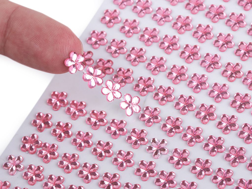 Samolepicí květy z broušených kamínků se poutavě třpytí. Ocení je příznivci scrapbookingu a dívky. Květy jsou nalepené na jednom archu podkladové folie, ze které se pohodlně odlepí. Jsou v řadách navzájem spojené lepicím proužkem, takže tvoří pásky. Celkem zde najdete 28 pásků (v každém je 11 květů). Z pásků je ale můžete odstřihnout na jednotlivé kousky. Hodi se na ozdobení přáníčka, krabičky, květináče, deníku, fotoalba apod.Doporučujeme je lepit na suchý, hladký a pevný povrch.