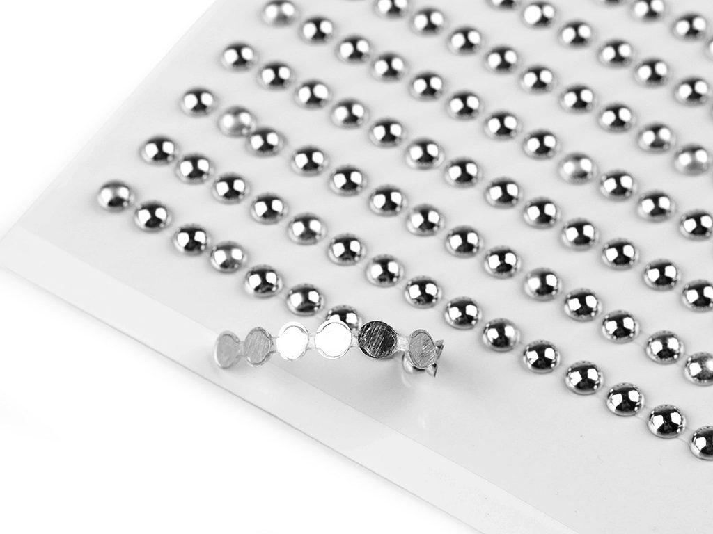 Samolepicí půlkulaté perly s metalickým leskem využijete k dekorování v technice scrapbooking. Všechny perly jsou nalepené na jednom archu podkladové folie, ze které se pohodlně odlepí.Perly v řadách jsou navzájem spojené lepicím proužkem, takže tvoří pásky. Celkem zde najdete 28 pásků (v každém je 16 perel). Můžete je i jednotlivě nastříhat. Doporučujeme je lepit na suchý, hladký a pevný povrch.
