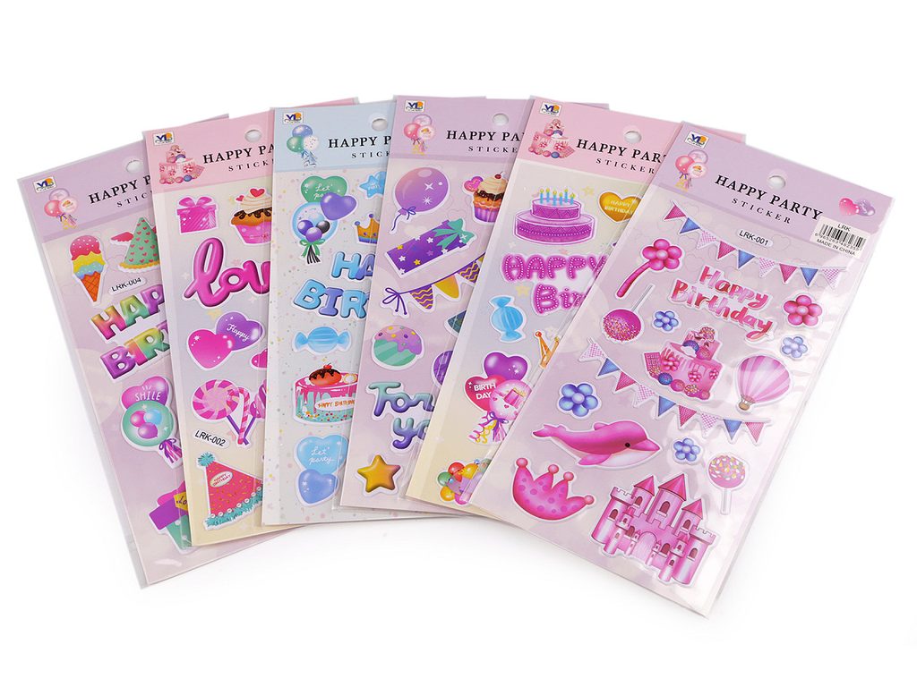 Samolepky s různými narozeninovými motivy jsou kvalitně zpracované. Jsou plastické, obrázky jsou stylizované kresby. Jsou oblíbené především dětmi ke zdobení sešitů, přáníček, pozvánek, krabiček, fotoalb, dárků apod. S oblibou je využívají i učitelé jako motivační odměnu pro své žáky. Samolepky jsou nalepené na jednom archu transparentní podkladové folie, ze které je stačí sejmout.Doporučujeme je lepit na suchý, hladký a pevný povrch.