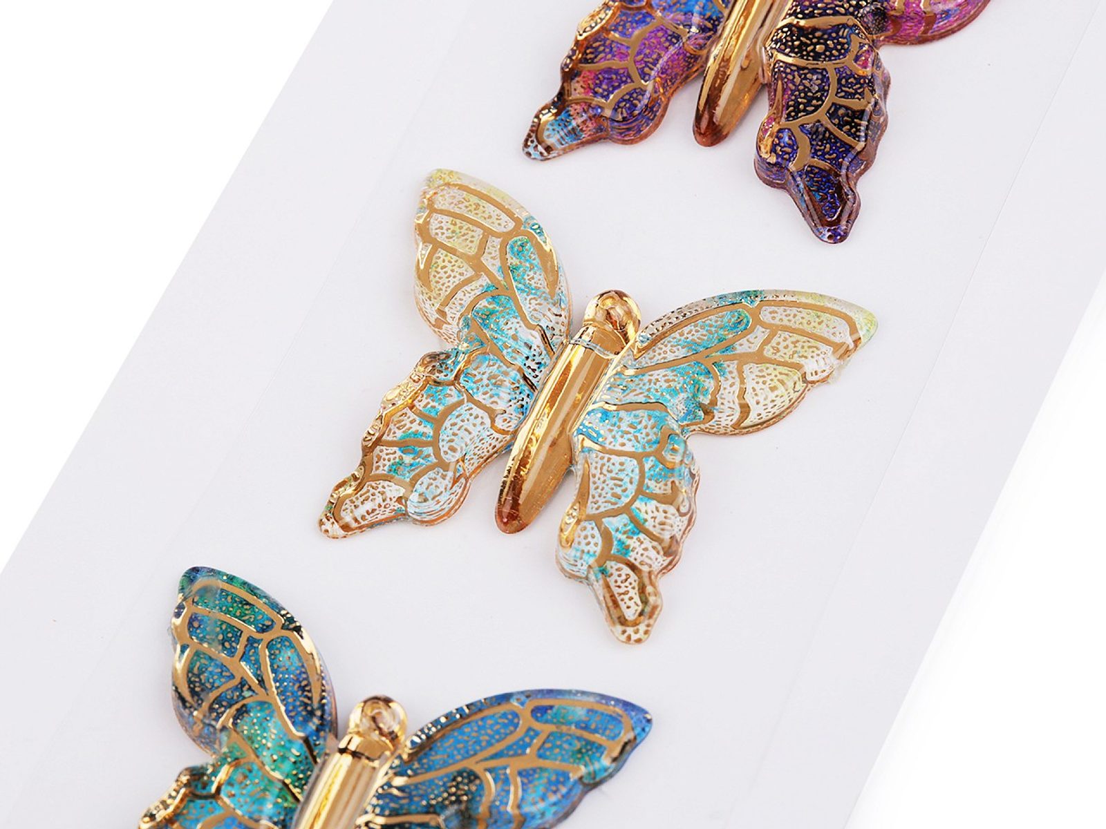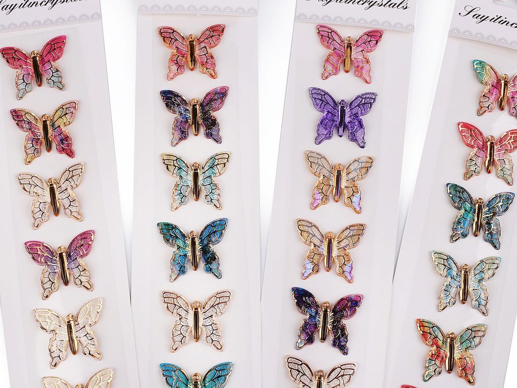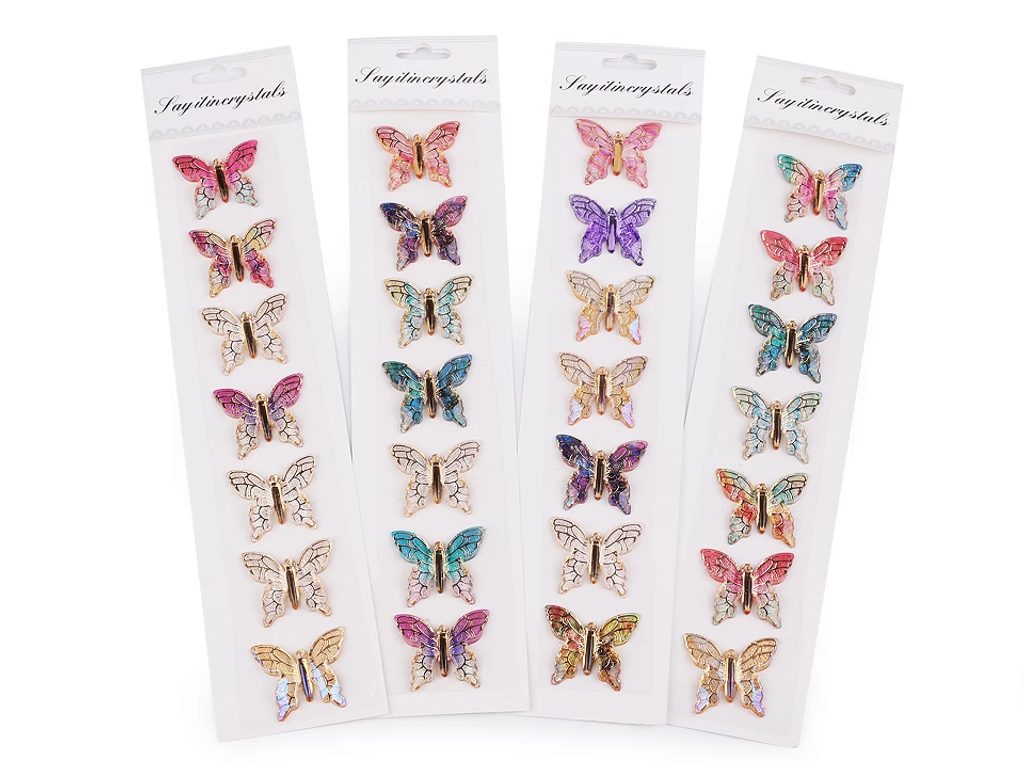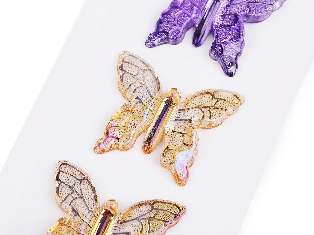Samolepicí motýlci z tvrdého transparentního plastu jsou velice poutaví. Mají jemné probarvení se zlatým potiskem žilek. Všechny samolepky jsou nalepené na jednom archu podkladové folie, ze které je stačí sejmout.Ozdoby doporučujeme lepit na suchý, hladký a pevný povrch. Využijete je ke zdobení přání, krabiček, zrcadel, rámečků fotografií, květináčů, deníků, fotoalb apod.