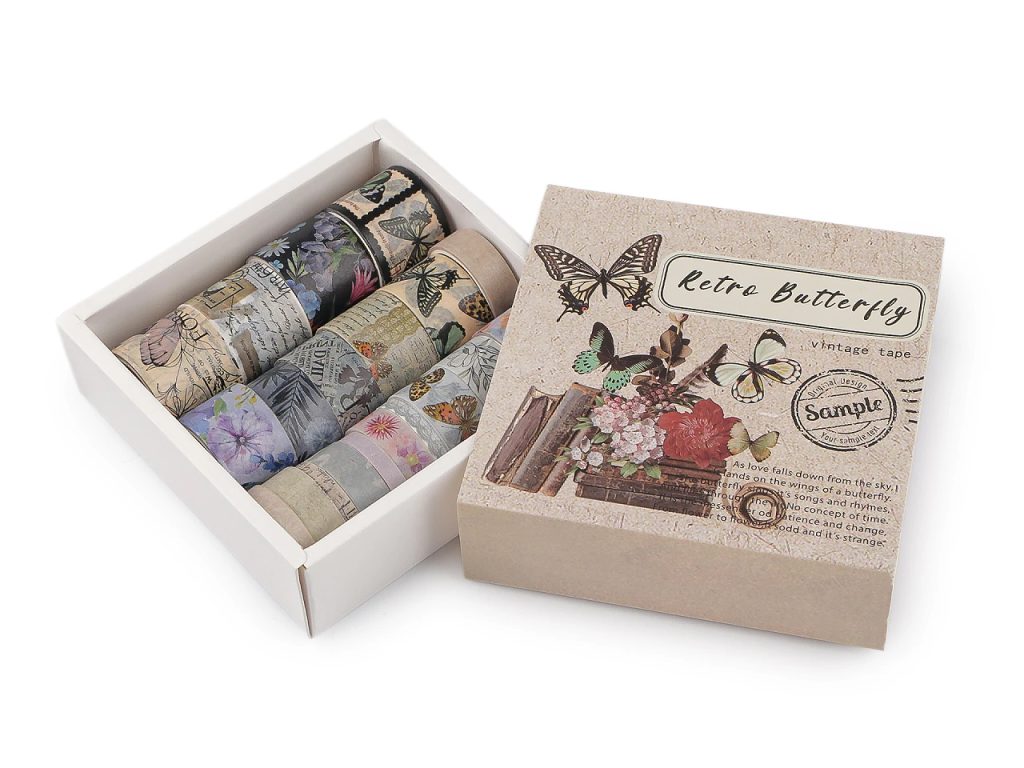Sada washi lepicích pásek s vintage motivy doslova okouzlí každého kreativce, bude i krásným dárkem. Pásky využijete na všech hladkých materiálech, jako je dřevo, plast, papír, sklo, atd. Můžete s nimi ozdobit dárky a krabičky či je nalepit na přáníčka, alba, fotorámečky, do diáře apod.Výhodou washi pásky je, že je z papíru a můžete ji lehce utrhnout. Díky samolepicí vrstvě je velmi snadno použitelná a nezanechává stopy po odstranění.