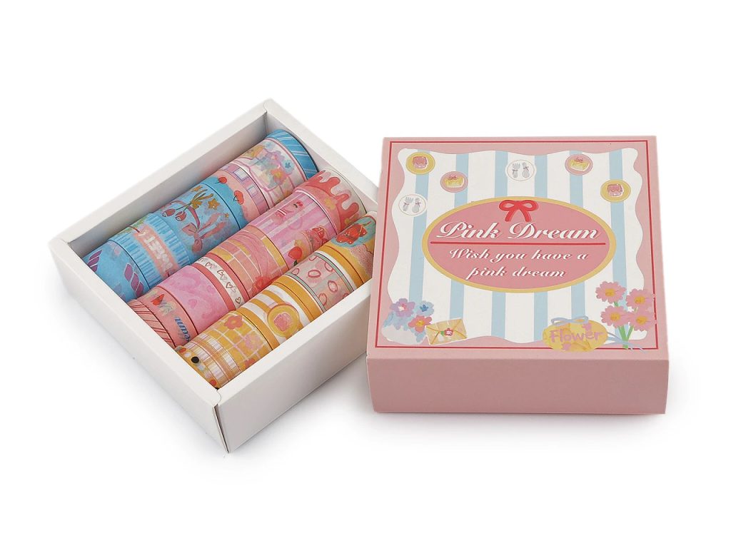 Sada obsahuje různé šířky pásek 0,5 - 2,5 cm, které jsou zabalené v papírové krabičce s potiskem. Krabička obsahuje cca 20 ks pásek, každý kotouček obsahuje cca 1,8 m pásky.