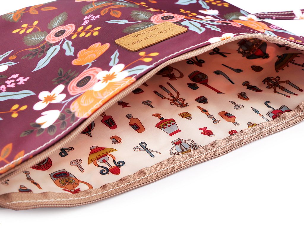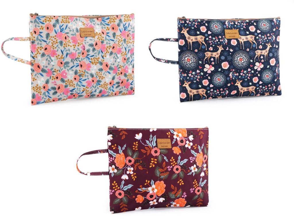 Velké pouzdro z nepromokavého materiálu je velice kvalitní a atraktivní. Má krásně zpracované detaily jako je semišový štítek hand made na přední straně a kovový přívěsek medvídka na zipu. Pouzdro je ploché, hodí se na skicáky, bloky, sešity, školní potřeby, výkresy, dá se do něj uložit laptop a tablet. Přesně se do něj vejde velikost formátu A4 - 210 x 297 mm. Uvnitř má pouzdro podšívku, která má rovněž poutavý potisk. Zapíná se na zip, jeho součástí je poutko na pověšení.- Rozměry:: 33 x 24,5 x 1 cm