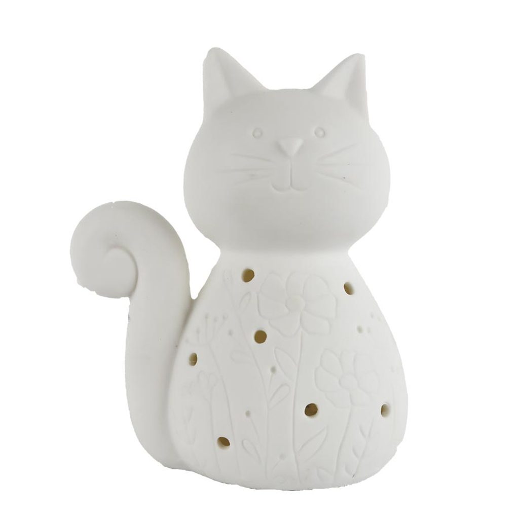 Dekorační kočka s LED osvětlením. 3x baterie LR44 je součástí balení. Rozměry : 9,7 × 6 cm, výška 12,1 cm. Barva : bílá. Materiál : keramika.