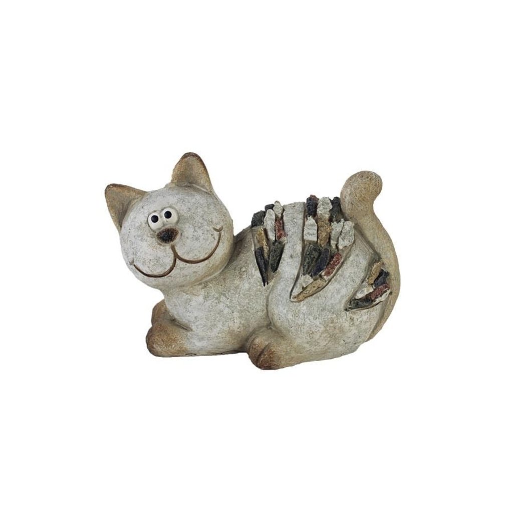 Dekorační kočka. Rozměry : 16,8 x 8,4 cm, výška 10,8 cm. Barva : kombinace šedá, hnědá, barevné kamínky. Materiál : polyresin.